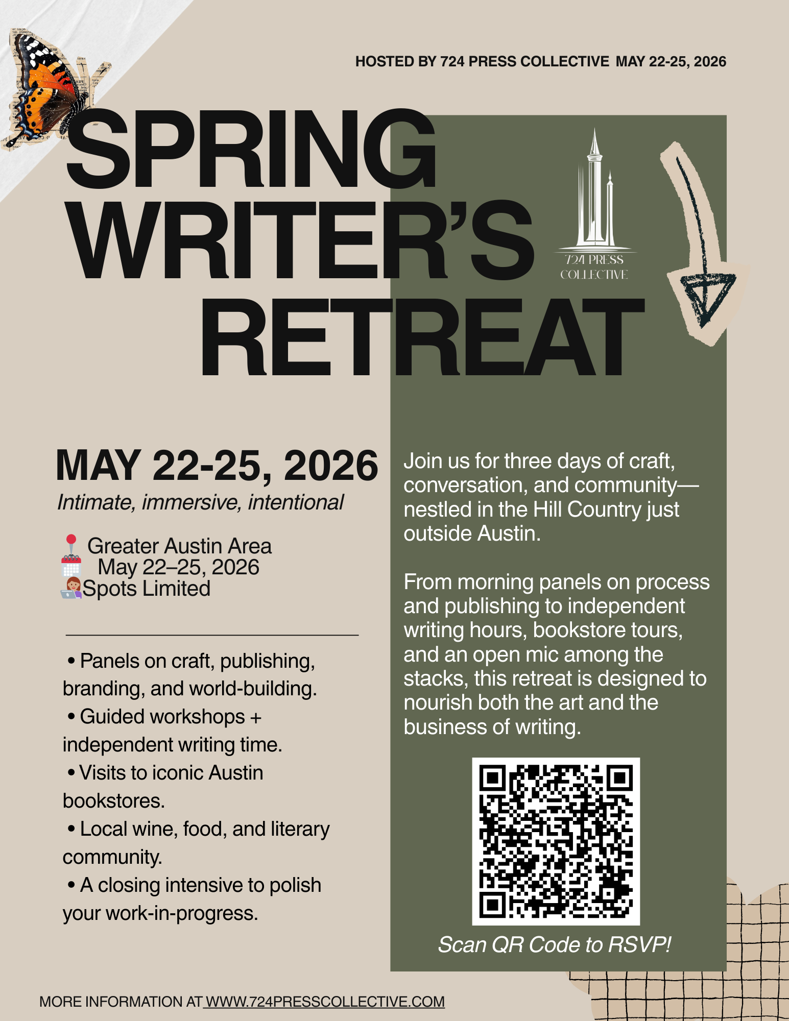 This is a retreat designed for growth, connection, and celebration of storytelling—with time to write, reflect, and be inspired. Reconnect with your writing, your craft, and your community this Memorial Day Weekend. Interested in sponsoring? Email us at 724presscollective@gmail.com.